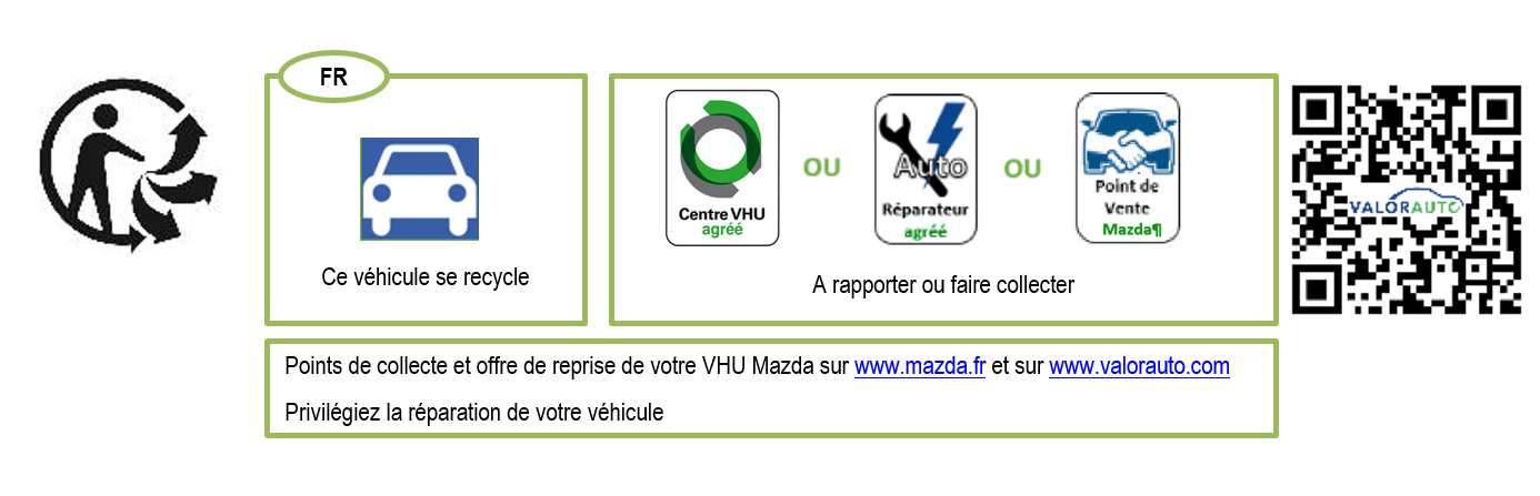 • Son Véhicule Hors d’Usage (VHU) peut être cédé à un réparateur agréé Mazda ou à l’occasion de l’achat d’un véhicule neuf ou d’occasion, à un concessionnaire agréé Mazda. Le concessionnaire/réparateur agréé Mazda en devient alors propriétaire et effectue l’ensemble des démarches administratives et règlementaires permettant son traitement.